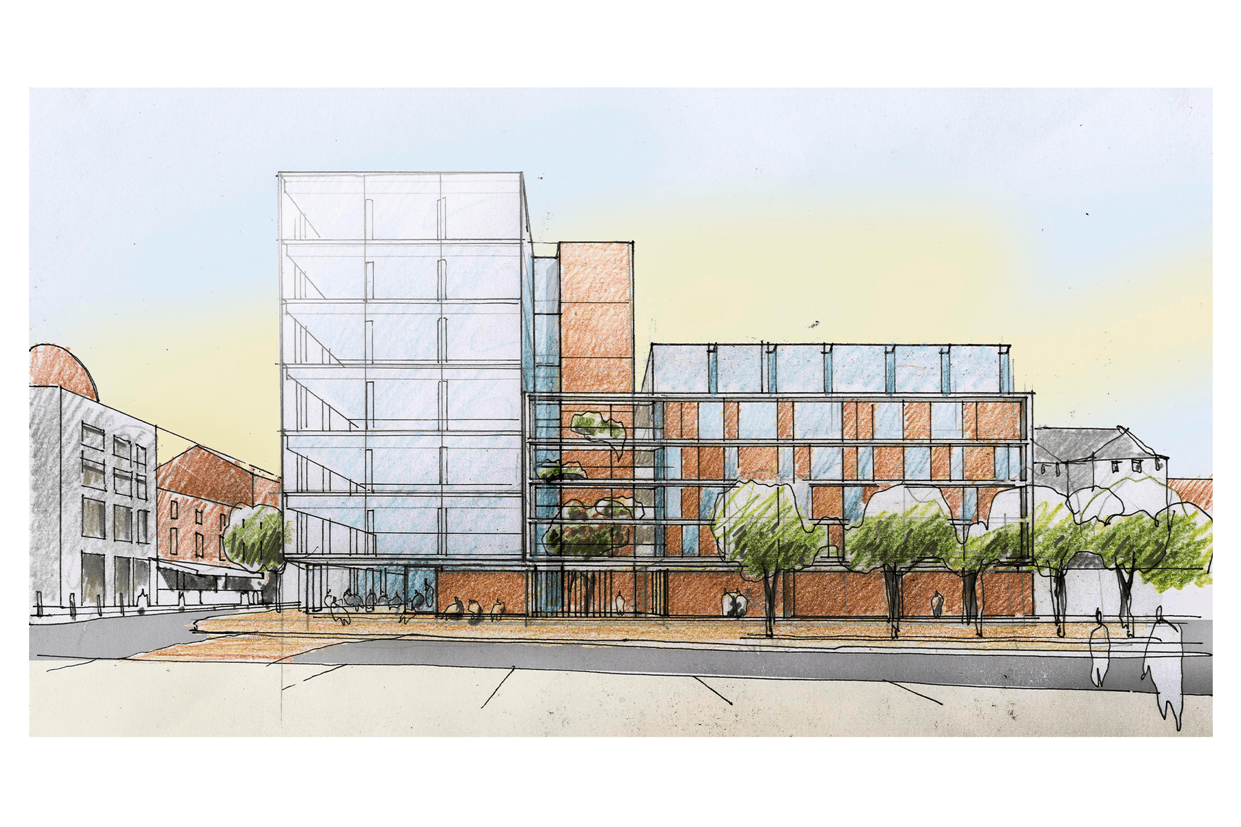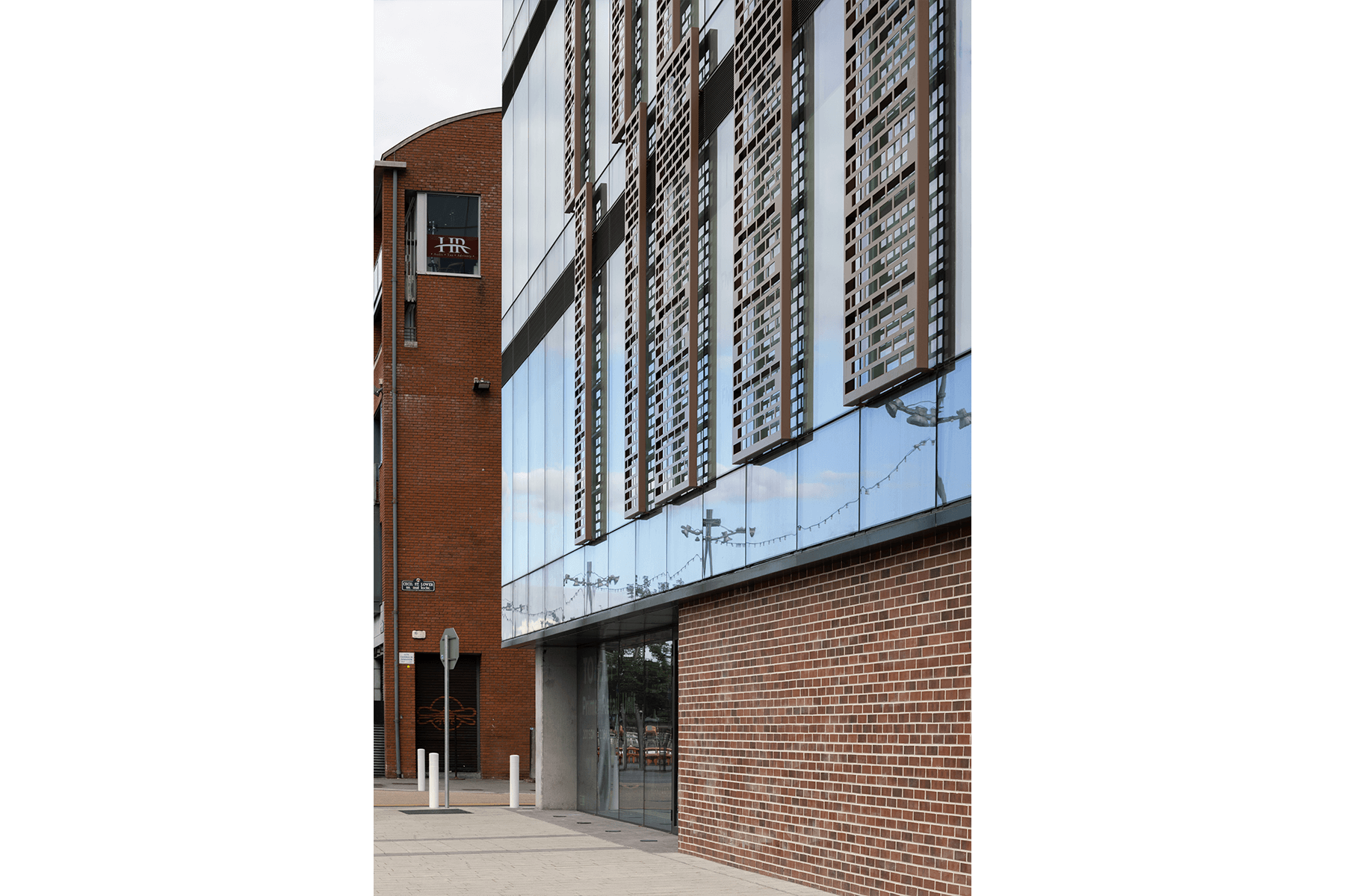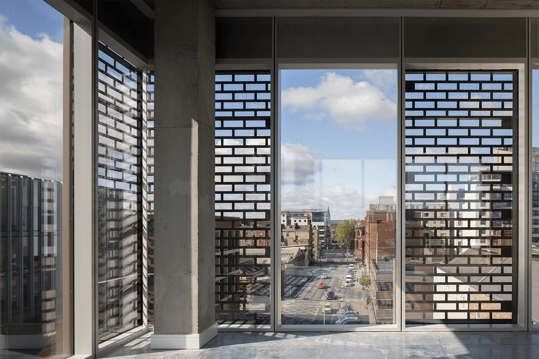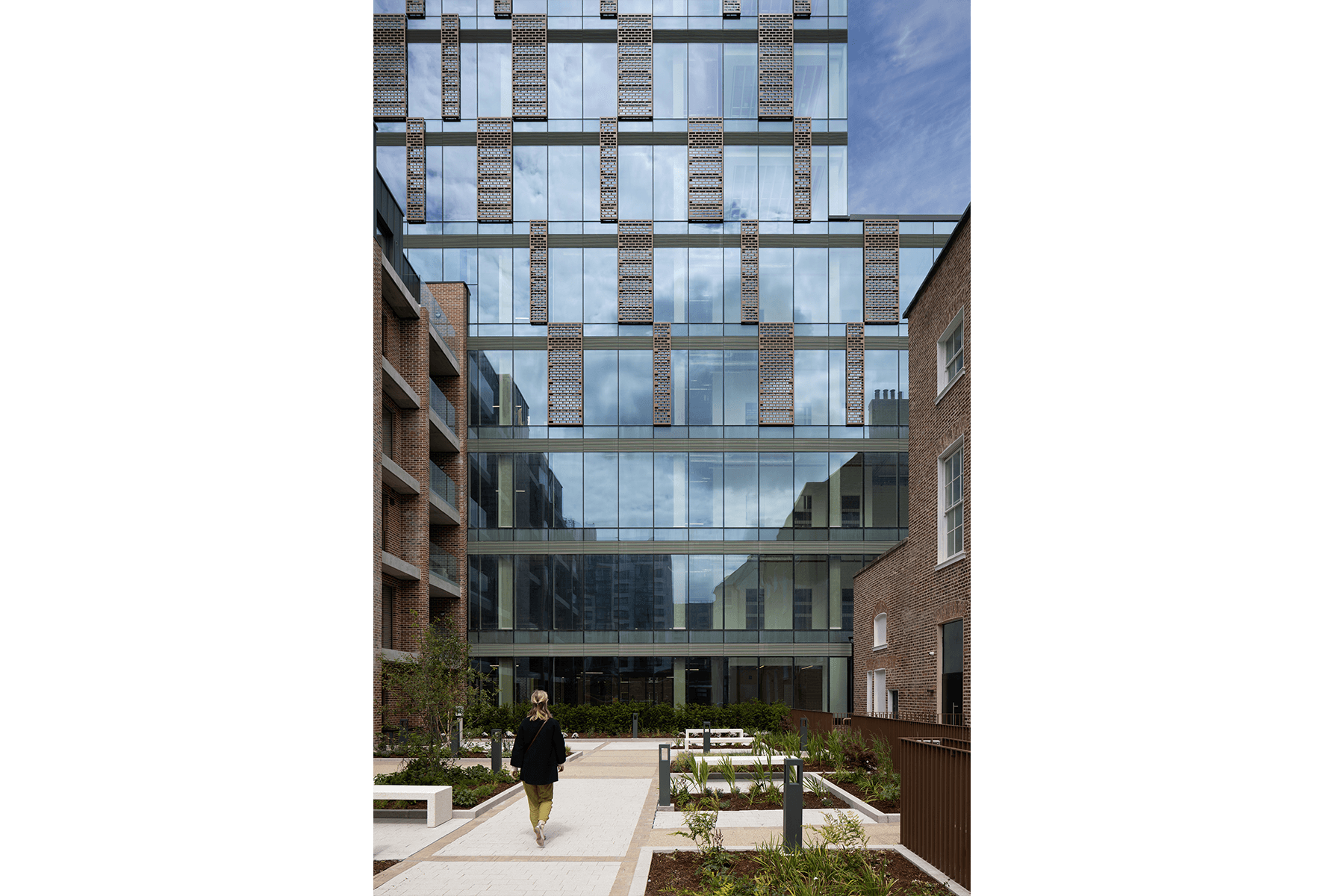 A predominately glass façade is interspersed with a rhythmic pattern of metal solar shading panels across all elevations. The perforated panels echo the brick architecture of the surrounding buildings in both form and colour.