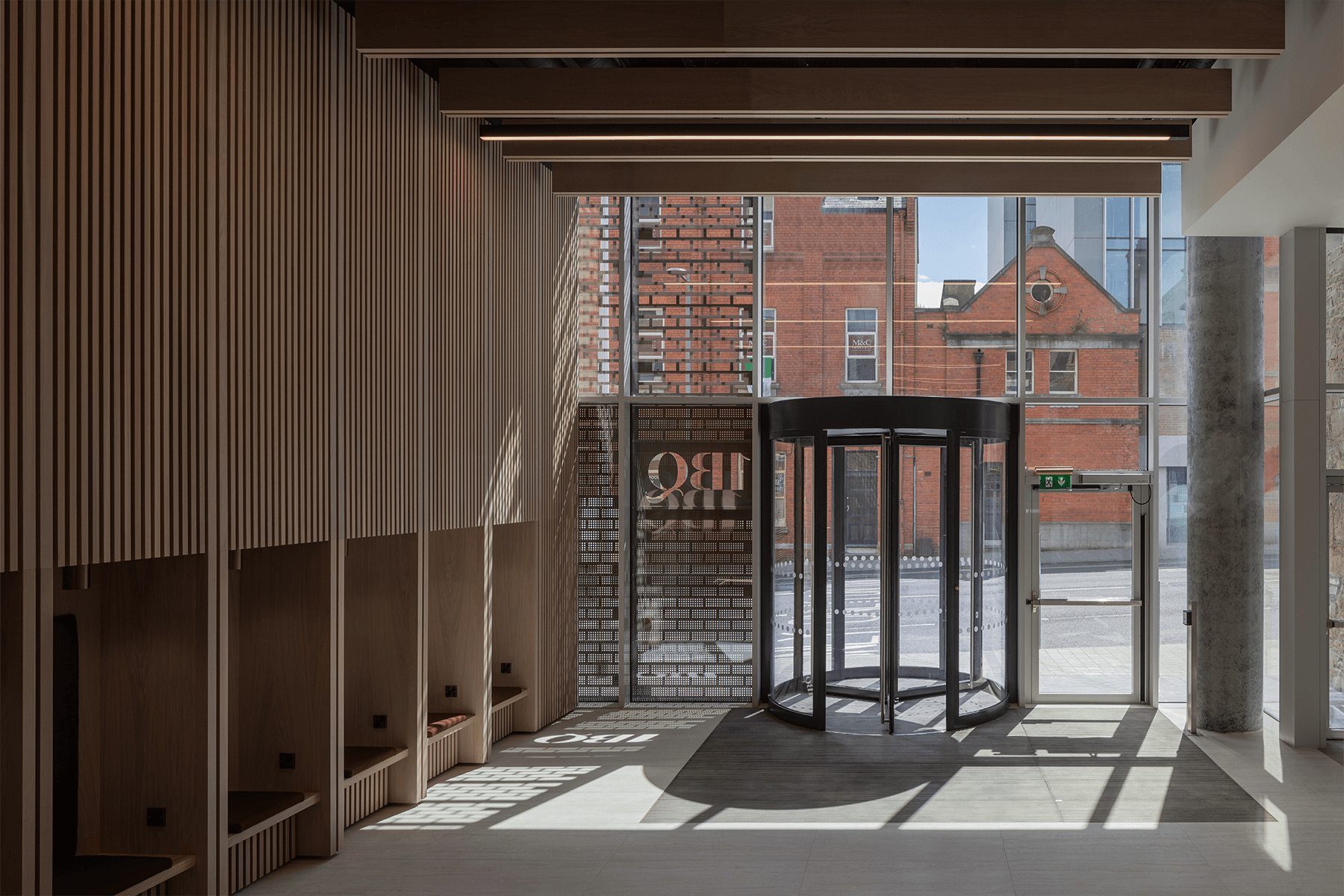 The narrow 9m infill site provides the office buildings main entrance lobby. A 4 storey building is slotted in to the architecture of Henry St. set back from the adjacent buildings and expressed in a glass and metal contemporary façade. A revolving door brings visitors inside from the city realm of Henry St.