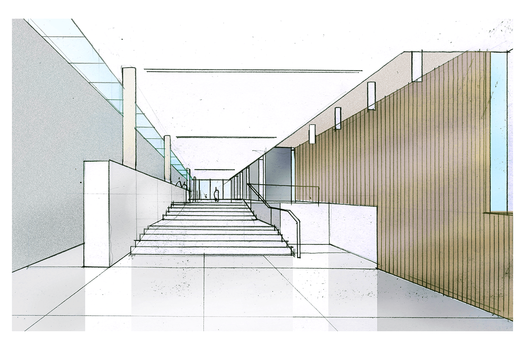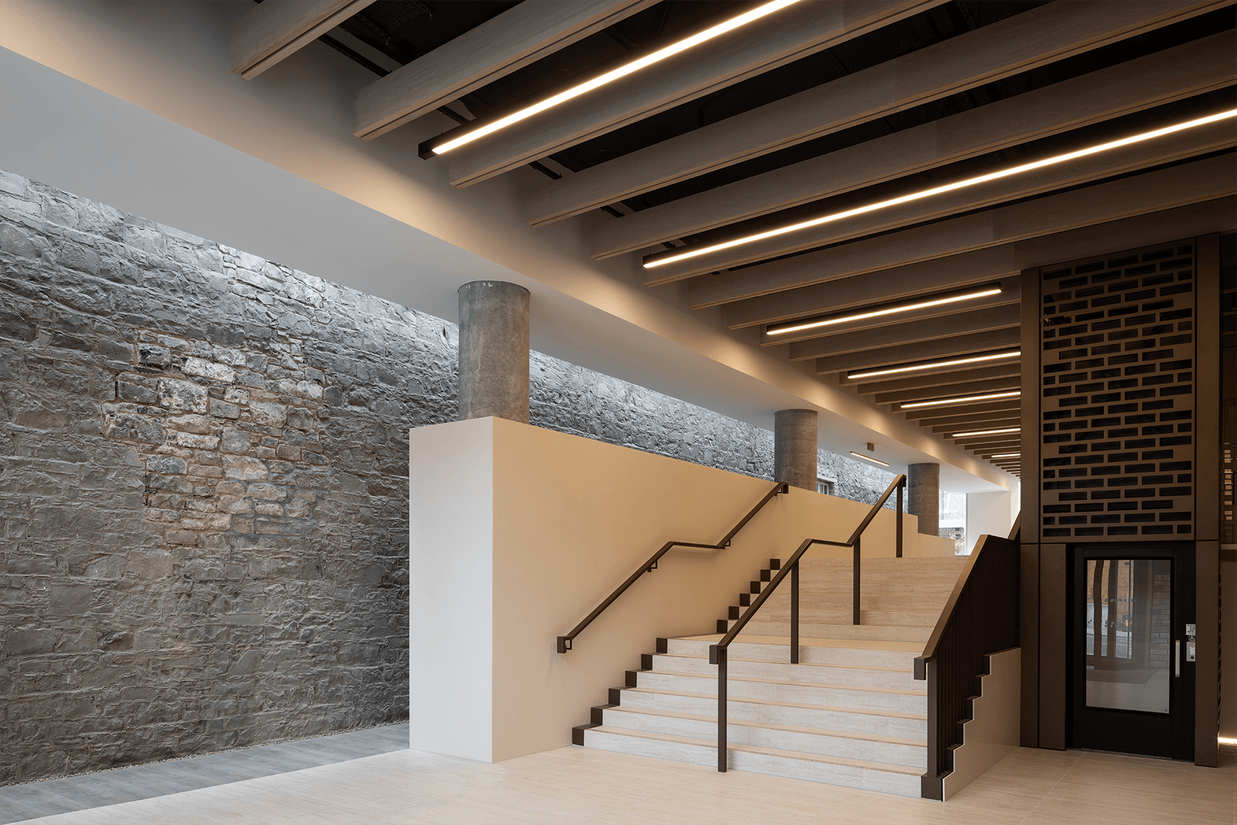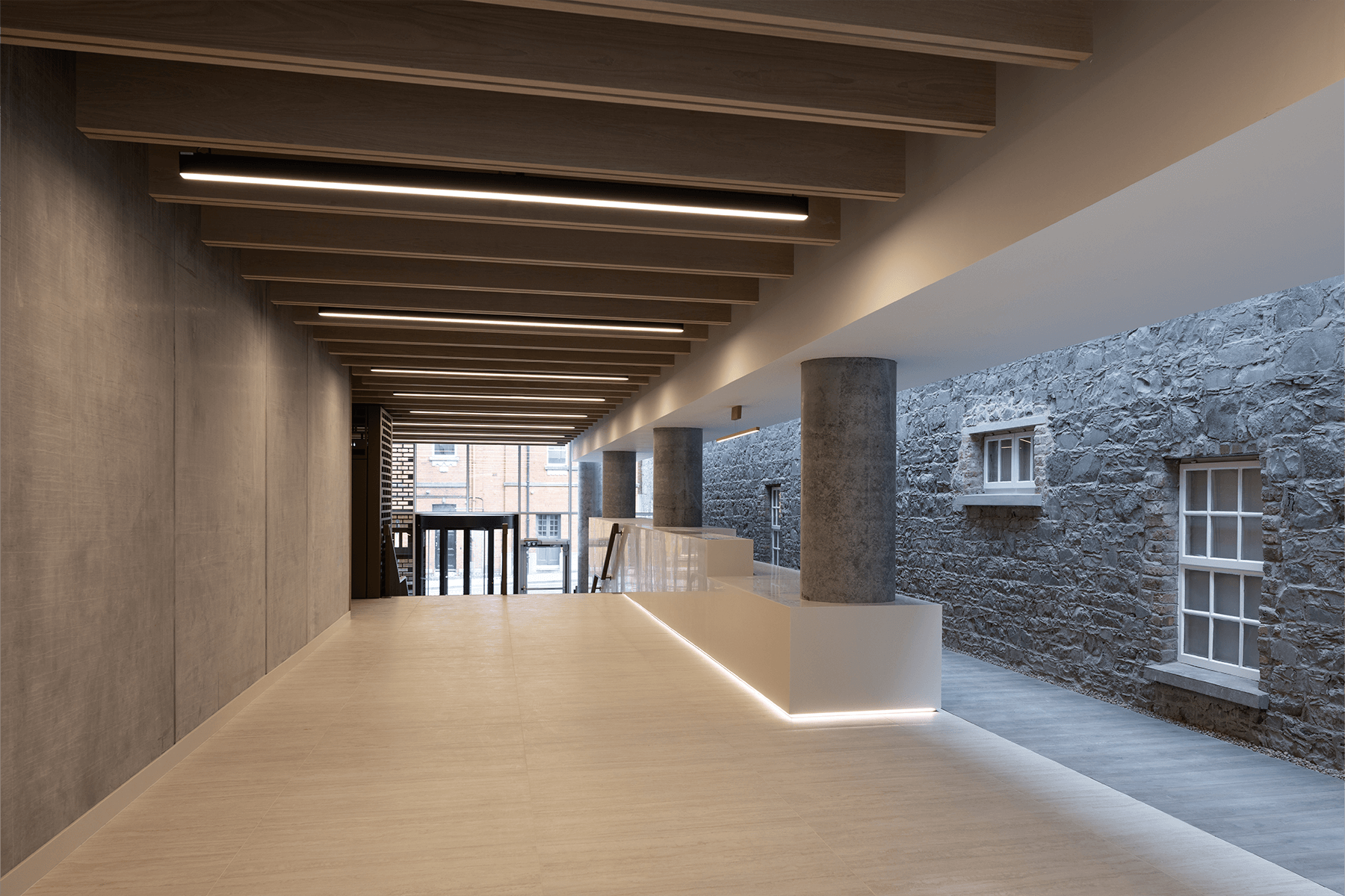 Smooth stone-like circular concrete columns, supporting the building above, are offset from the old stone wall of the internal façade. A long linear rooflight provides a strip of daylight along the length of the foyer space.