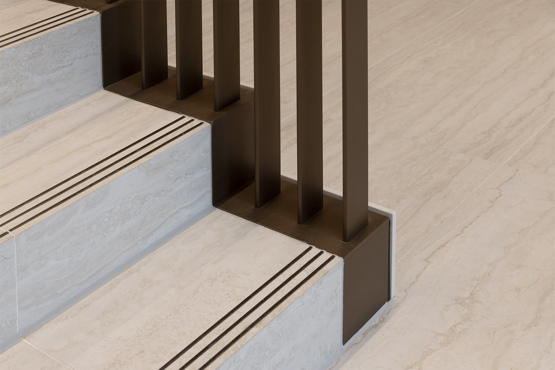 Light cream travertine tiles with bronze detailing enhance the simple internal expression of the lobby. A dark bronze handrail extends from the lower lobby to upper lobby level. The perforated metal panels of the façade clad the platform lift – a subtle internal expression of the architectural exterior.
