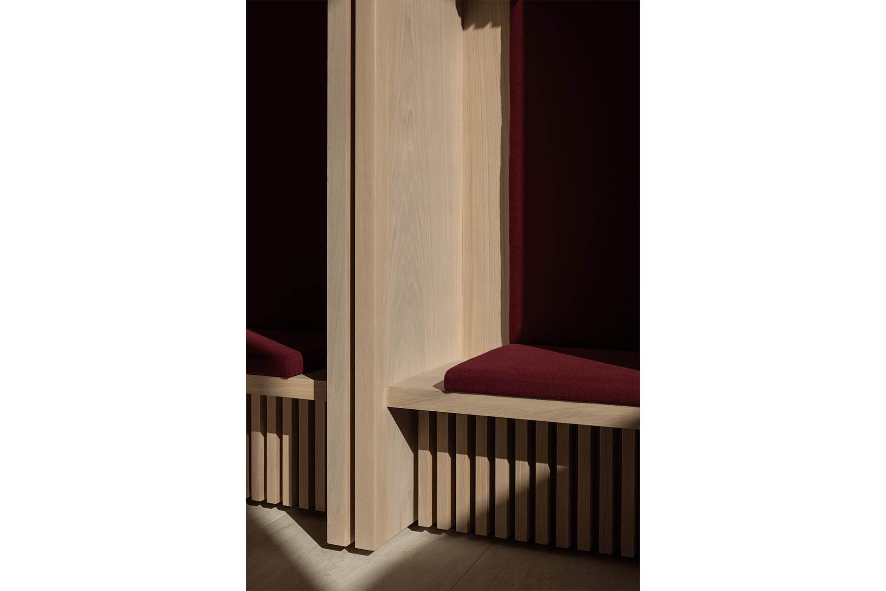 With its simple materiality, baffled ceiling and strong vertical proportions the space is designed as a calm transition from city to office.