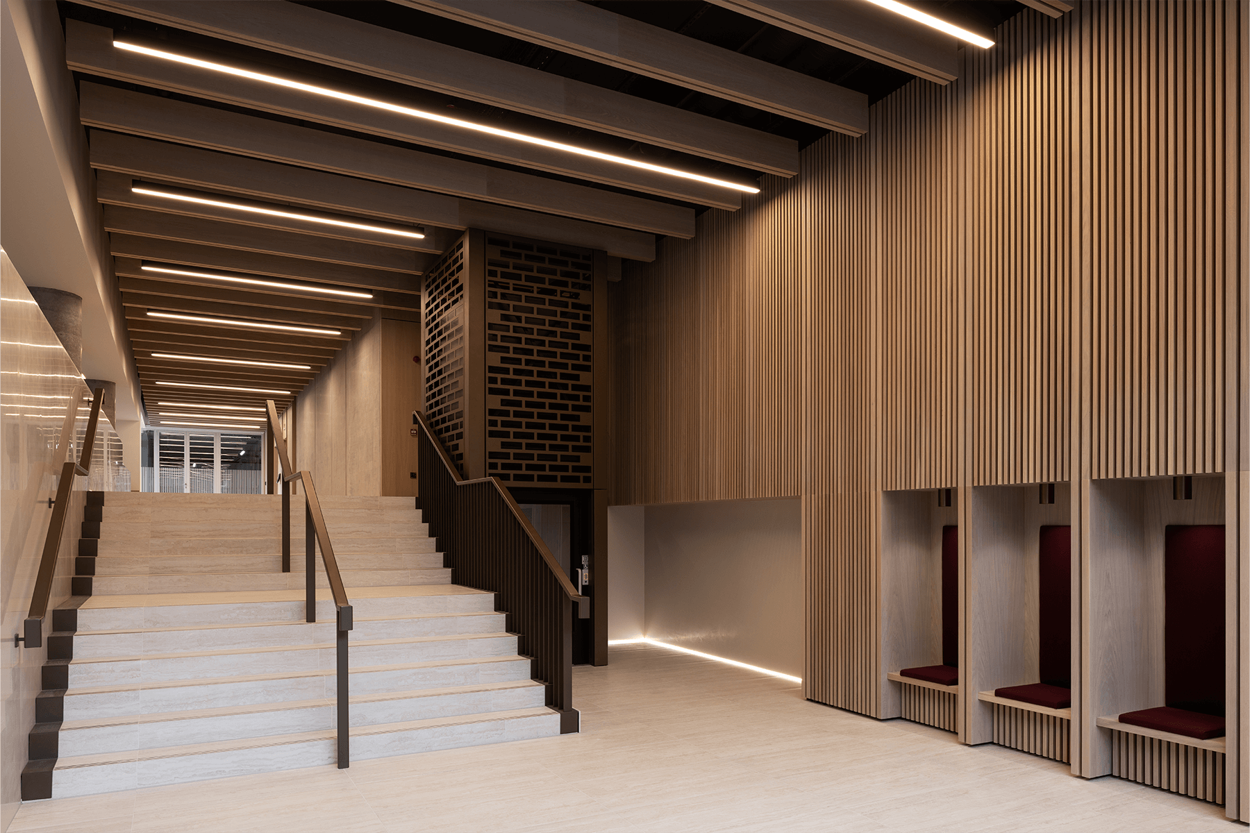A double-height space of elegant proportion is expressed with timber, natural stone and exposed concrete surfaces. Recessed timber seats are formed below the vertical clad timber panelling wall omitting the need for additional loose furniture offerings in the lobby space. A series of linear timber baffles hang below the service zone at ceiling level guiding the eye to the upper level lobby space and extending the simple material palette to all surfaces within the space.